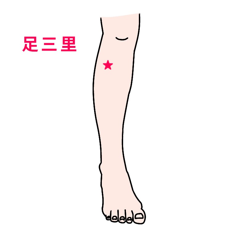 ◆足三里(あしさんり):膝下外側 → 胃腸と免疫の働きを強める